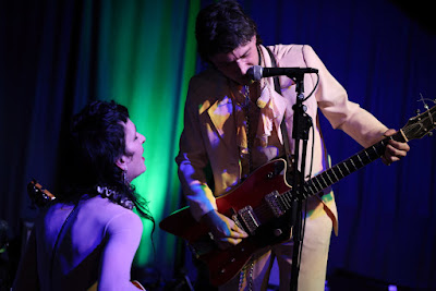The night didn't start until around 9:20 p.m. with Crush being the first band up. The band started things off with what Rosow called their variety show. The duo went from experimental punk to rap to country. The packed crowd did not mind the variety show what so ever. What I always love about a Crush show is Rosow playing the saxophone. She did so for the first couple songs. One has to make a comment about her fashion choices as it was (to me) obviously intentional. Around her neck was a ruff collar -- that was worn traditionally in the 1600s -- but instead of hers being made from cloth it appeared to be made out of either metal or plastic. She wore a tight body suit paired with a leather corset. The final touches were red socks and glitter covered shoes.